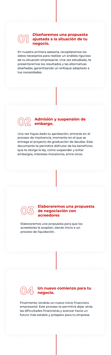 Por ejemplo, Juan tiene un pequeño restaurante. Tiene deudas con un banco por un préstamo comercial, una deuda con su proveedor de alimentos y otra con una empresa de servicios. Debido a una caída en las ventas, se ha atrasado en sus pagos por más de 90 días. Quiere mantener su negocio abierto y acordar nuevos términos de pago con sus acreedores. En casos como este, cuando no puedes pagar dos o más créditos, puedes iniciar un proceso de reorganización para negociar un acuerdo de pago.
